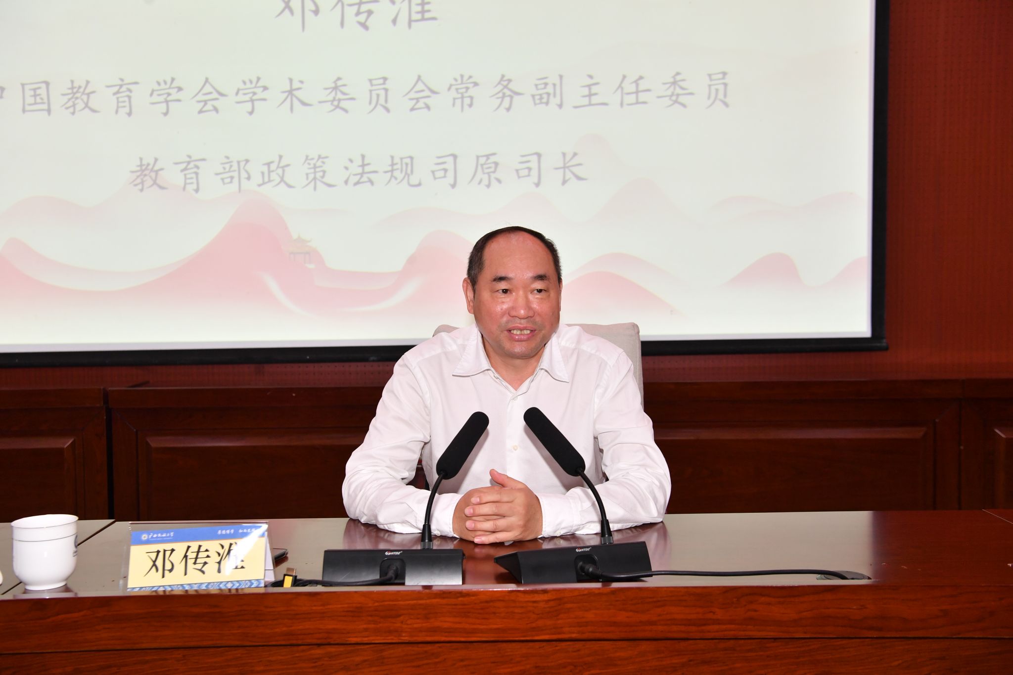 中国教育学会学术委员会常务副主任委员、教育部政策法规司原司长邓传淮应邀为研讨班学员做了“深入学习领会习近平总书记教育的重要论述,大力弘扬教育家精神”的专题报告,报告围绕习近平总书记提出的“九个坚持”、教育的根本问题、加快推进教育强国建设和弘扬践行教育家精神等做了深入的解读和阐释。报告过程中,邓传淮结合自己的工作经历和人生阅历,谈了如何更好地为学、为事、为人的体会。