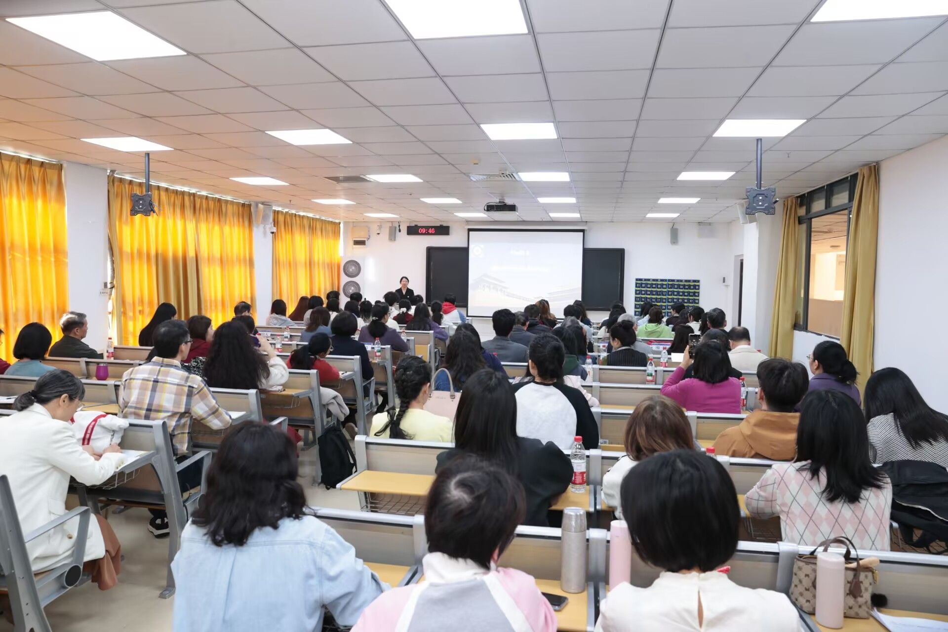 课堂上,刘雪芹教授以“两脚踏中西文化,一心评宇宙文章”为引,介绍林语堂及其著作《京华烟云》,为现场师生呈现了一场专业且精彩的双语教学示范。她通过文本细读、译文对比、案例评析、互动研讨等形式,引导学生深入领略文学经典的魅力与中西文化交流的精髓。在文化内容翻译研讨环节,她聚焦文化负载词的回译问题,组织学生交流分享,既让学生亲身体验翻译的挑战与乐趣,更深刻揭示:人工智能时代,批判性思维与创新能力才是翻译专业的核心竞争力。